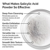 100% pure cosmetic grade salicylic acid powder that gently exfoliates, unclogs pores, and helps reduce blemishes for smoother, radiant skin.